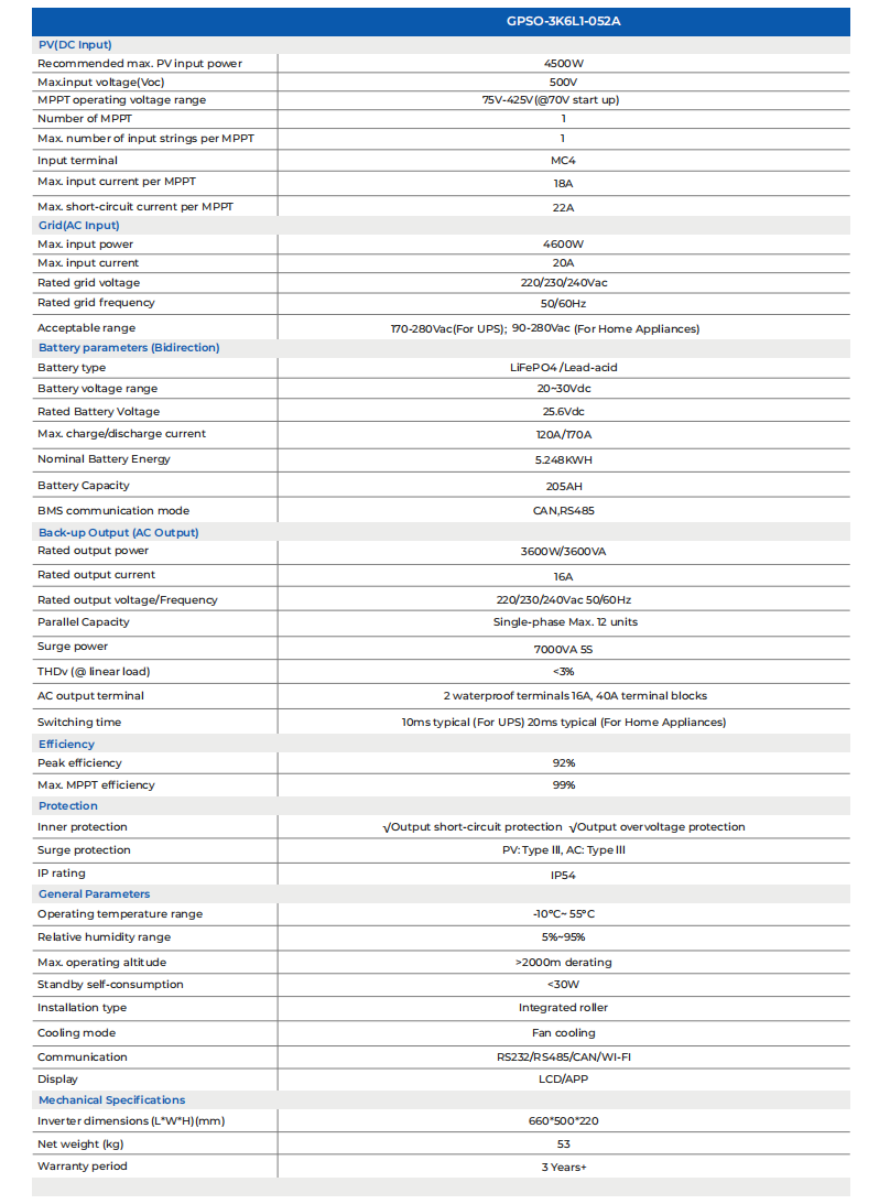 Gospower 3.6kW Smart Small Solar Power Station. The Gospower GPSO series all-in one energy storage system combines an inverter, MPPT solar charger, and battery. It supports a maximum of 12 units for paralleling. The battery capacity ranges from 5.12kWh to 20.48kWh with up to 4 units paralleling.